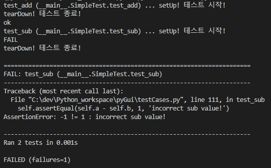self.assertEqaul() 메서드의 인자로 결과값, 예상되는 값[, 에러 메시지]를 넣어 테스트를 한 결과
